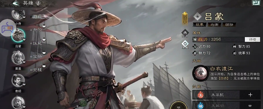 第一个为大家介绍的就是吴国里面的吕蒙,吕蒙这个角色他的天赋就是非常有特点的,他的天赋叫做白衣渡江,这个天赋是一个类似被动的效果,可以在战斗一开局的时候就使用起来,而且在一开局触发的话,后面的几个混合当中都是可以持续生效的,带来的主要效果就是给队友带来一定的隐形护盾效果,所以是属于一个保护类型的技能在追击格上的武将,有他这个天赋保护的话,就不会被敌人的单体技能给击中,那么在前几个回合,大家可能在防护能力上面不那么强的时候用到吕蒙,至少在自身队伍的生存上面,大家不用担心前期就被对面给压制,后期的话用他这个技能也可以放心的进攻起来,这样在开局里面大家就可以利用吕蒙的效果得到足够的优势。