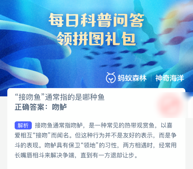 以上就是“接吻鱼”通常指的是哪种鱼?神奇海洋今天答案最新2025年10月20日分享,更多相关攻略内容,请点击关注更新!