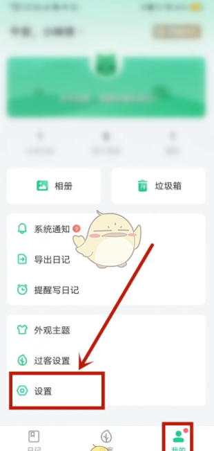 1、吾记日记app页面,点击右下角我的,选择设置项目。