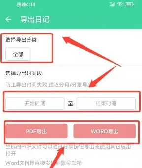 4、进入导出日记界面,选择导出分类、选择导出时间段,选择导出方式进行导出。