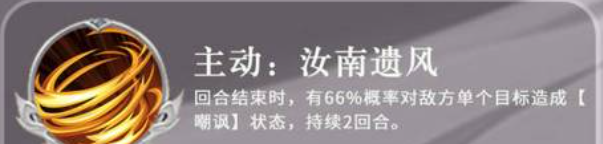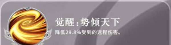 而他的主动技能叫做如南遗风,这个技能是在一个回合结束之后才可以使用的,在其中会有66%的概率,可以给敌方的一个目标带来嘲讽的状态,所以上面说到如果想要控制的话,这个嘲讽技能就是他可以在这个时候用到的一个主动技能,一般放在控制流里面,其实是可以在开场时期就用到敌人身上的,另外他还一个觉醒技能叫做势倾天下,这个技能效果特别简单,在游戏当中主要就是降低袁绍受到的远程伤害,这里降低的数值达到了29.8%。