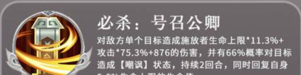 那么这个角色大家要用的话,首先看到的第一个技能叫做必杀技,大招攻击的这个技能可以对敌方的一个目标造成一定的输出效果,这里造成的数值是根据袁绍他的生命上限11%的数值,再加上攻击75%的数值,然后还有一个固定数值是876点的伤害,这样结合起来的话,整体的伤害数值其实并不比一些输出角色要低,而且他还伴随着66%的概率可以对这个目标再一次带来嘲讽的影响状态,同时给他自身带来的是恢复效果,当然恢复的百分比是比较低的,只有5.6%左右的生命上限数值的恢复效果,但是相对于奶妈奶量不够的情况下来说,他的这个恢复效果还是可以给他自己续一下命的。