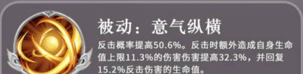 而他的被动叫做意气纵横,这个技能就是跟反击效果有关的,被动效果触发的时候,他在反击的概率上面会提升50%的数值,所以在他使用反击的时候,还会额外造成生命上限11%左右的伤害数值,这里的伤害数值还可以额外再提升32%左右的效果,这是给自身带来的恢复效果,会根据他的反击伤害带来15%左右的数值恢复,他的这个恢复数值就根据他的反击效果来判定,所以大家用他的这个反击效果越厉害的同时,他自身恢复的生命数值百分比就越高。