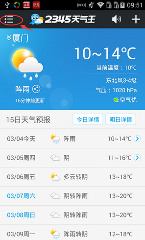 1、打开2345天气王进入后,点击【菜单键】图标: