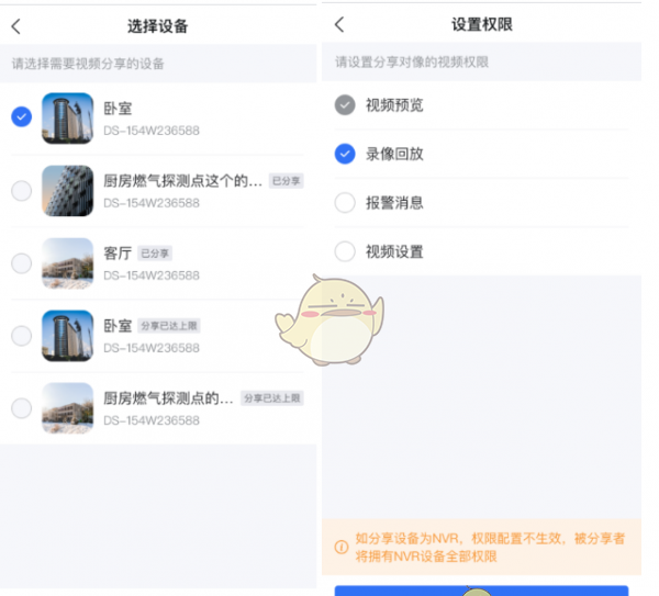 3、设置设备视频权限:可以对“视频预览”(默认必选)、“录像回放”、“报警消息”、“设备设置”进行选择;若分享的设备是NVR,则默认被分享者拥有全部权限。