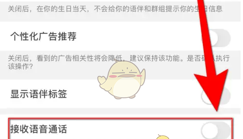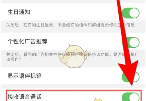 3、设置界面点击【接收语音通话】后面的圆点