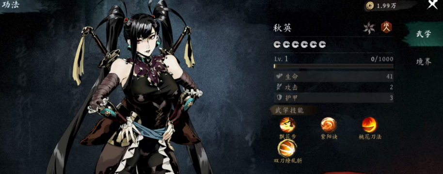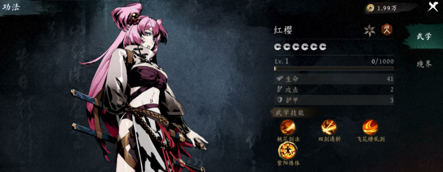 接下来再给大家介绍一个英雄叫做红樱,这个角色在使用一些剑法的时候可以带来很强的效果,她在使用武器的时候造成的攻击能力是最强的,在命中敌人之后还可以造成3次10%的伤害效果,这里如果使用双剑作为武器的话,她的战斗力是最强的,而且只要是攻击目标达到连续5次命中的话,这里就可以额外再次打来一个缭乱斩的技能,这个技能对于命中敌人来说是可以再次触发一次攻击的能力,而飞花缭乱剑这个技能,是让她的缭乱斩造成的伤害可以提升50%的数值,所以她后期的炼体之后带来的攻击能力会更高一些,但是同时她在生命下降的数值上面也会更高一些。
