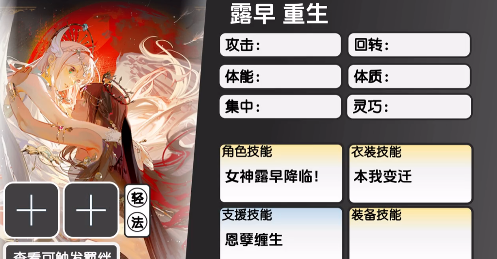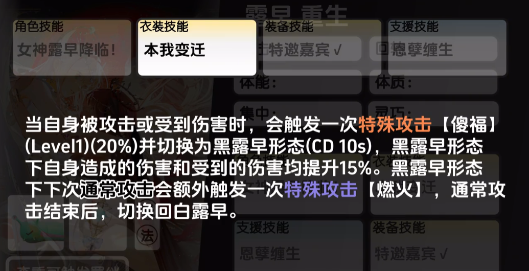 她的衣装技能叫做本我变迁,是当露早被攻击或受到伤害时,会触发一次特殊攻击,这一次的特殊攻击叫做【傻福】,同时切换为黑露早形态,这个状态的时间有10秒,黑露早形态下自身造成的伤害和受到的伤害均提升15%的数值,且黑露早形态下下次通常攻的会额外触发一次特殊攻击【燃火】,通常攻击结束后,会再次切换回白露早的状态。