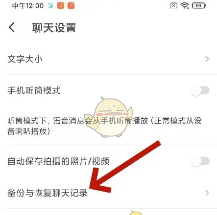 3、接着,进入聊天设置页面后,点击备份与恢复聊天记录。