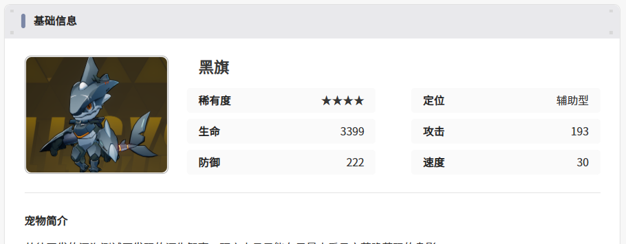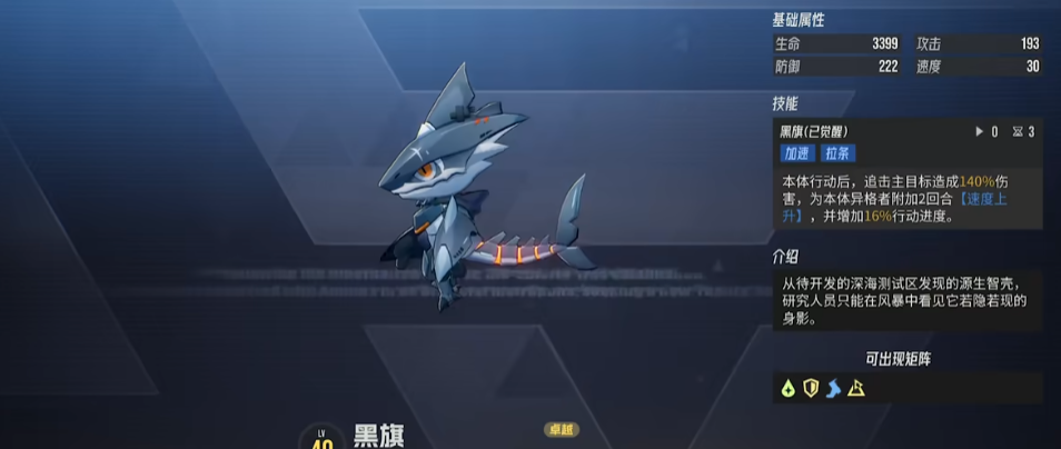 黑旗表面看起来是一个比较神秘的智壳,那么在搭配的时候,大家可以看到它更为全面性的效果,目前黑旗的强度还是比较高的,因为它的稀有度也达到了四星的能力,但是它定位是一个辅助型的智壳,所以在搭配角色上面的时候,建议大家也选择一些辅助类型的角色进行搭配,它的基础性能上面其实还是比较全面的,比如生命数值上面,以及防御属性,还有速度属性,都是基础数值就比较可观的,在速度上面基础就可以达到30点,所以在战斗里使用黑旗也可以快速的进行行动,在抢占先机的时候,大家就可以凭借这个这个速度带来足够的先机抢占能力。
