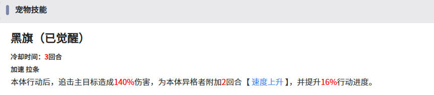 另外黑旗因为自身也具备一定的追击效果,那么在使用它作为辅助的时候,用到的主体增益也是不错的,每当角色使用完了一次行动之后,黑旗就会开始使用这个追加的效果,造成一次追加攻击一般是针对敌方的主要目标进行攻击的,造成攻击的时候,伤害最高的百分比是可以达到140%,所以这个百分比跟很多的辅助类型角色都是可以比一比的,而且黑旗同时还具备了给携带者提升的能力,此时触发提升效果的话,可以让角色在后期的两个里面度得到速度上升的增益。