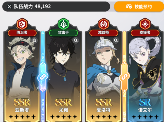 前期阵容不需要纠结,抽卡系统赠送的魔导士凑在一起就是超强的开荒队。具体的搭配自然就是亚斯塔、尤诺、诺艾尔和夏洛特。在队伍中亚斯塔是肉盾担当,自带一个大范围的挑衅技能,可以把敌人的火力全部都引到自己的身上,可以保护队友安心输出。尤诺不仅是一个攻击手,同样也是一个减益师,在输出稳定的同时还可以给敌人挂各种负面效果,可以削弱敌方的战斗力。诺艾尔主打的是防御辅助,可以给队友增加防御buff,让整个队伍的生存能力能大幅度的提升。