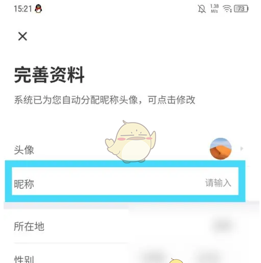 3、进入完善资料页面,输入新的昵称,点击完成。
