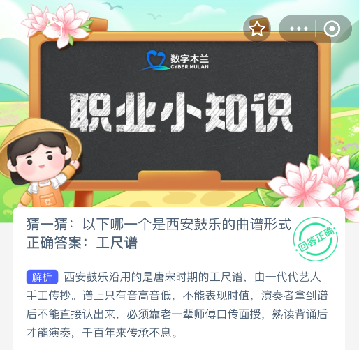 猜一猜:以下哪一个是西安鼓乐的曲谱形式?【蚂蚁新村每日一题】2025年10月22日题目已发布!坚持答题,积累木兰币,即可加速小镇建设。答对本题,立即可享“产速+3/时”的加速奖励!今天正确答案是【工尺谱】。西安鼓乐沿用的是唐宋时期的工尺谱,由一代代艺人手工传抄。