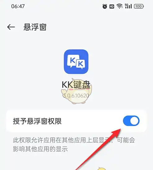 5、将“授予悬浮窗权限”旁的小滑块点亮即可启用。