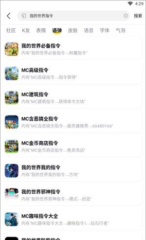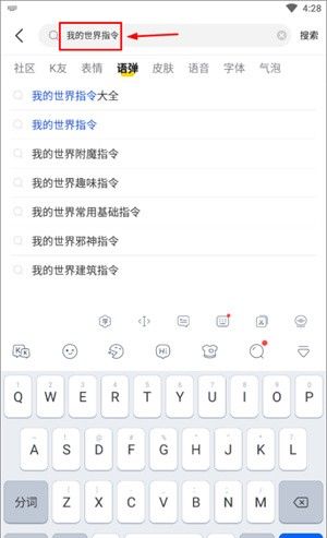 打开KK键盘APP,在搜索栏输入“我的世界指令”或直接搜索编号,从推荐列表中选择所需指令,点击后自动复制到剪贴板,进入游戏聊天框长按粘贴即可发送指令,还能通过“语弹-聊天神器”功能一键发送连招指令,解放双手提升游戏效率!