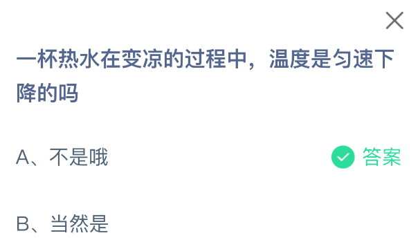 以上就是一杯热水在变凉的过程中,温度是匀速下降的吗,支付宝蚂蚁庄园2025年10月24答案最新,更多精彩内容,请点击关注更新!