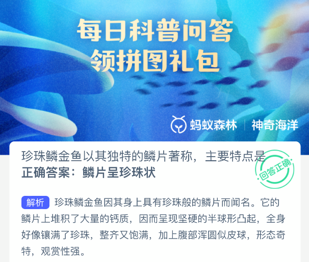 珍珠鳞金鱼以其独特的鳞片著称,主要特点是?【神奇海洋】10月23日新题目已开答!正确答案现已公布,点击领取拼图,一起为修复海洋生态贡献力量!今日正确答案是:【鳞片呈珍珠状】。珍珠鳞金鱼因其身上具有珍珠般的鳞片而闻名。
