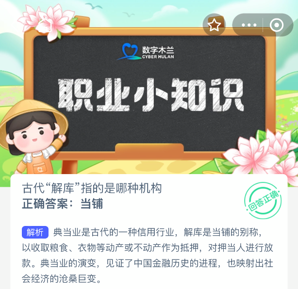 古代“解库”指的是哪种机构?【蚂蚁新村每日一题】2025年10月23日题目已发布!坚持答题,积累木兰币,即可加速小镇建设。答对本题,立即可享“产速+3/时”的加速奖励!今天正确答案是【当铺】。典当业是古代的一种信用行业,解库是当铺的别称,以收取粮食、衣物等动产或不动产作为抵押,对押当人进行放款。
