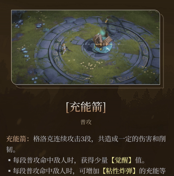 她的普通攻击“充能箭”为三段式打击,每段命中均可削减敌方韧性,并为自身积累觉醒值。同时,每次攻击还能提升粘性炸弹的等级,使其在后续爆发中更具威力,是构建完整输出循环的重要起点。