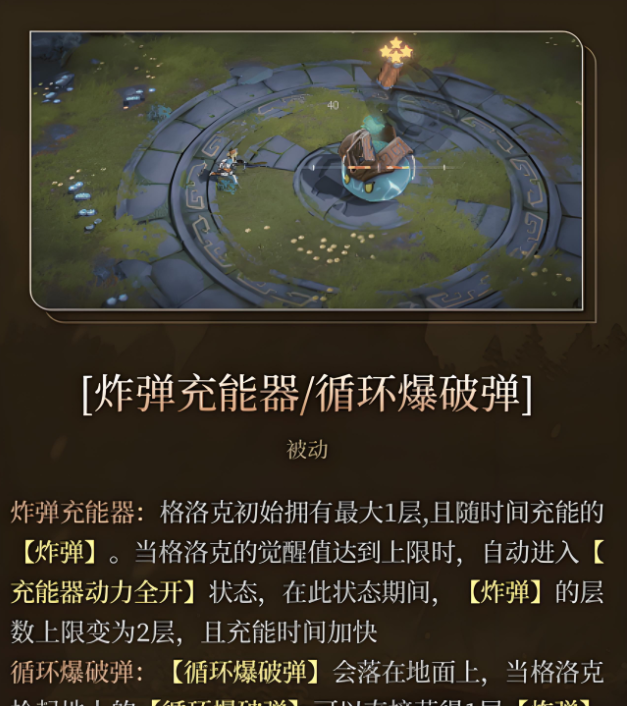 格洛克具备两个核心被动:“炸弹充能器”和“循环爆破弹”。前者初始拥有1层充能,当觉醒值满时进入加速状态,显著提高充能效率;后者则允许她在爆破弹落地后拾取并立即获得1层炸弹充能,实现资源的高效再利用,形成稳定的技能衔接链。
