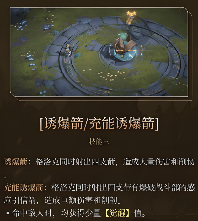 三技能“诱爆箭”可在短时间内快速射出4支箭矢,造成多段伤害与削韧效果。该技能在命中时会触发目标身上的粘性炸弹,并额外获取少量觉醒值,进一步加快能量循环速度。