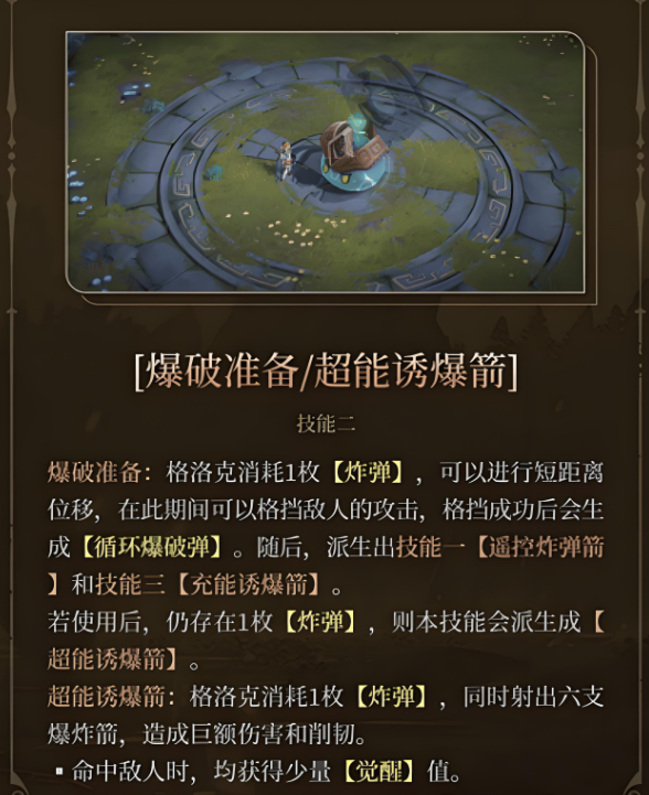 二技能包含“爆破准备”与“超能诱爆箭”。“爆破准备”需消耗1枚炸弹,发动时进行短距离闪避并可格挡敌方攻击,成功防御后生成一枚可重复使用的爆破弹;“超能诱爆箭”同样消耗1枚炸弹,向前方射出六支爆炸箭,覆盖范围广,适合清理密集敌人。