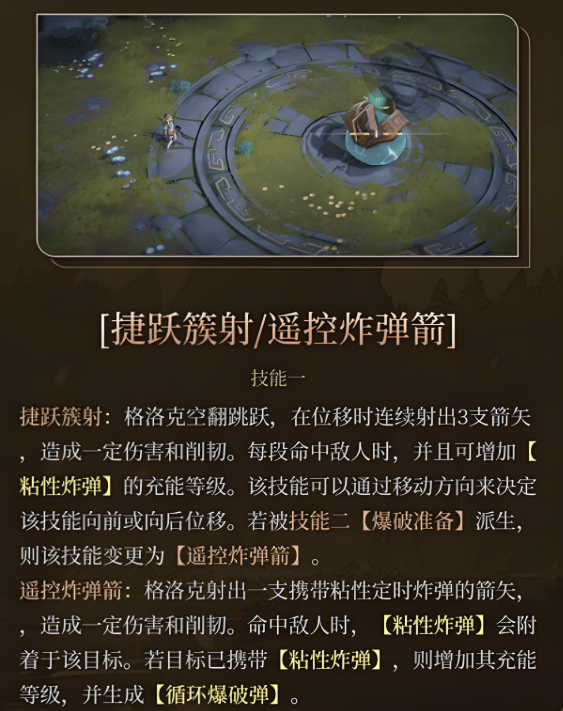 主动技能方面,“捷跃簇射”可在跳跃位移过程中连续射出三支箭矢,兼具伤害与削韧能力,且命中后可提升粘性炸弹等级。“遥控炸弹箭”则发射一枚附着型定时炸药,命中后黏附于目标身上,便于后续引爆操作,增强控制与输出节奏。