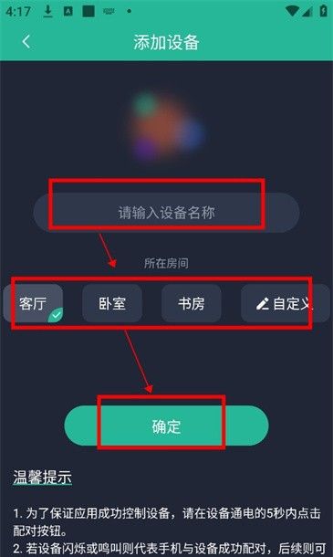 2、输入设备名称以及需要应用到的房间后点击确定