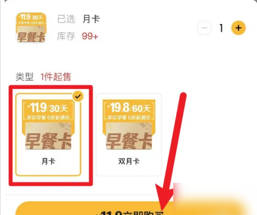 接下来选择早餐月卡,再点击【立即购买】就可以了