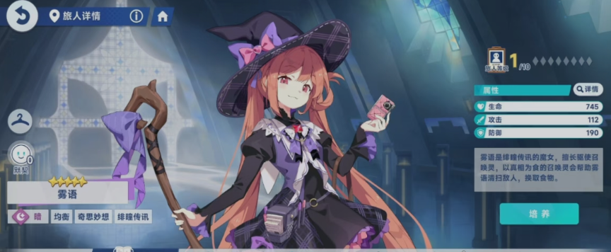 雾语目前在游戏当中带来的稀有属性是比较少见的,达到了五星级的品质,而且是属于暗元素类型的角色,所以用雾语的话,搭配同类属性就可以触发一些暗系的羁绊效果,目前用她放在阵容里面,建议是作为一个远程的魔法输出角色使用,她在魔法技能上面有足够的伤害输出能力,普攻叫做彗星连锁,使用这个技能进攻的时候,雾语会利用自己手中的扫把作为武器,对敌人进行攻击的同时,带来的是4次的连续输出方式,此时造成的攻击效果是根据她的属性,也就是暗系带来的此类属性伤害。