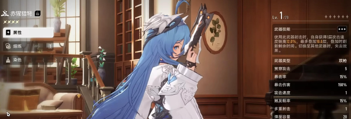 赤猩猎弩:基础属性好像并不是很亮眼,攻击力是5,暴击率是15%,暴击伤害就可以达到150%。如果只是从数值方面来看,比不上同级别的手枪,但是核心的竞争力就在于攻击速度叠加。每一次在射击时就可以获得一层10%的攻击,速度最高就可以叠加10层,一旦在叠满之后就可以获得100%的攻击速度。在实际战斗的过程中还需要记住不换枪的原则,中途切换武器就可以让所有的攻击层数清零,那之前的设计就等于白叠。在游戏的两种场景中都需要使用,第1个就是打单个精英怪,从第5层开始就能感觉到射击速度加快。第二就在于清理小怪,例如3~4个小怪的波次,并不需要去频繁的走位换武器。