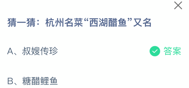 以上就是猜一猜:杭州名菜“西湖醋鱼”又名,支付宝蚂蚁庄园2025年10月27答案最新,更多精彩内容,请点击关注更新!