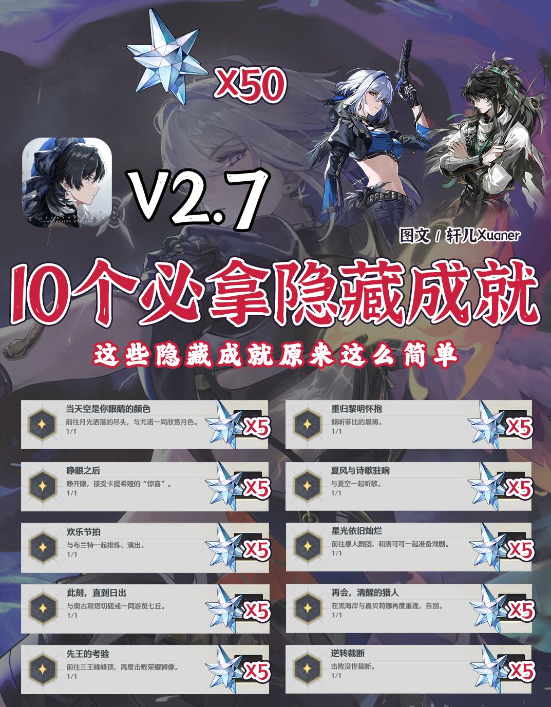 2.7上半共有10个隐藏成就:其中8个和黎那汐塔角色对话的成就,2个击败强大BOSS的成就。