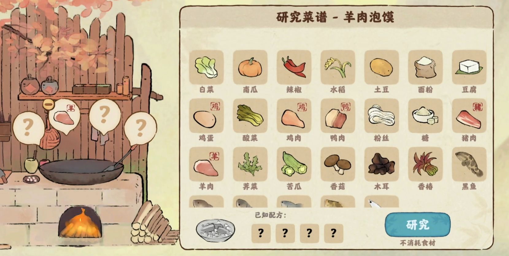 当玩家们提升了自己的厨艺等级后,就可去制作对应等级的美食了,但要想解锁这些美食的菜谱,各位还得先进行解锁才行。解锁的方法很简单,各位只要选择一道自己还未解锁的菜谱并进入研究界面,就能在里边通过搭配来完成菜谱的解锁。每道菜在未解锁前所需要用的食材都会被隐藏起来,各位需在能使用的食材里挑选出合适的来进行试烹饪,如果所选的食材与菜谱里的食材相符,就能将美食制作出来,菜谱也会随之点亮。