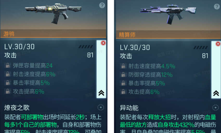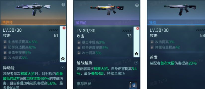 而比较优秀的两个SSR级的武器游鸮和精算师就是两个很不错的输出武器,前者拥有着燎夜之歌的专属能力,被装配后的角色可以使可部署物的出场时间延长2秒,并且在战斗场景中多出一个自己的部署,本身和部署物的伤害都提高6%,射击速度提高12%,并且此状态可叠加;而后者则是有异动能的效果,装配的角色在每次释放大招的时候都可以对射程范围内最低血量的敌方造成高达432%的自身电磁攻击伤害,而自身在叠加到电磁伤害后会提高5.6%,最高可以叠到四层,而有更多其他的装配解锁之后,游鸮和精算师都会拥有着更高的能力以及输出。