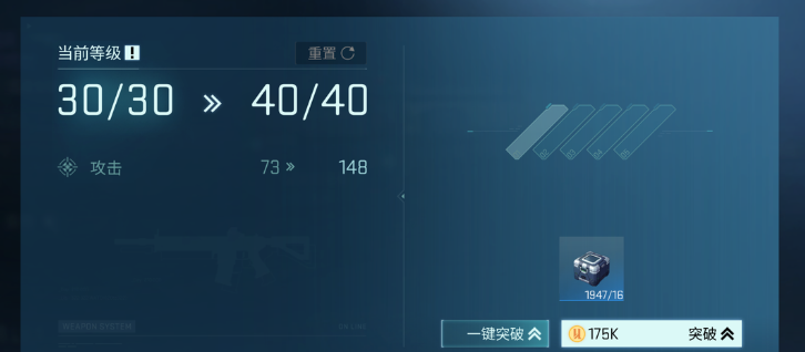 除了对于枪支的一些基础属性要了解,那么对于武器的专属养成,玩家们也不能错过,武器的养成升级是可以突破的,而当他的等级分别到30级,40级,50级,60级,70级的时候,都可以进行突破,例如对当指挥官的角色等级达到35级的时候,武器如果没有突破,那么它将会一直长期停滞在三十级,而将其突破之后,不仅提高了武器的升级上限,还有更多的配件也解锁了,而每一个配件解锁出来的条件也需要玩家们点进去自行查看,这些都是为了进一步提高武器的输出。