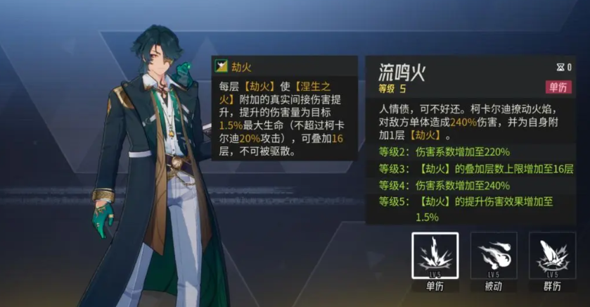 柯卡尔在游戏当中的身份是海拉德银行的经理人之首,所以是一个实权人物,剧情里面他拥有的权利也是比较多的,他的普攻叫做流鸣火,使用攻击的时候会带来火焰类型的攻击,这个火焰会针对一个地方的单体目标进行输出,造成的伤害有240%的伤害数值,此时他也可以为自身叠加一层劫火,这个激活的状态是他本身特殊的一个状态,这个状态可以是涅生之火,上面附加足够的真实伤害提升,那么提升的伤害量为目标1.5%的生命数值,这里不超过柯卡尔20%的攻击数值,而且这个效果也是可以叠加到16层的,并且他有一个能力是不可以被驱散,那么他的被动就是这个涅生之火,这个被动相当于是柯卡尔的一个核心机制,因为只要是场上存在一些友方单位的话,柯卡尔就无法被敌方选中为他的攻击中目标。