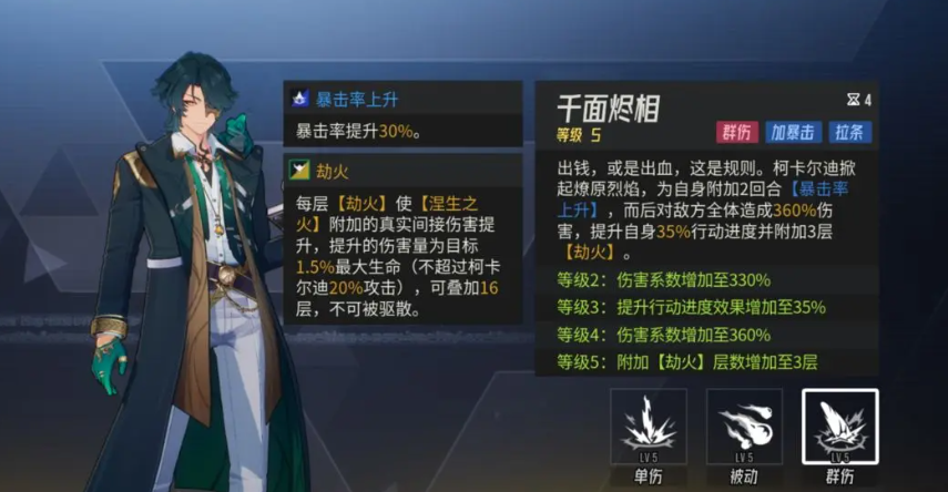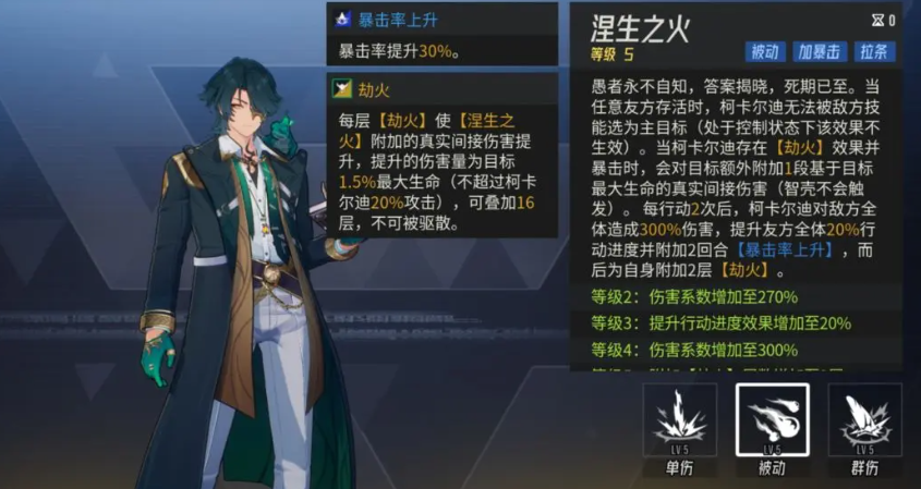 当然这个效果如果是处于被控制情况下的话,那么效果是不会生效的,而且柯卡尔他只要存在足够的结火,并且产生暴击,那么他的这个被动就会让他对目标额外附加一段输出,此时的出也会根据对方最大生命值的真实伤害来进行百分比输出,这里的话造成的伤害达到了300%的效果,而且还可以提升用队友的能力,此时在友方行动进度上面会得到20%的提升,且有暴击率上升的状态,可以叠加到两个回合,最后给自身带来的增益是两层劫火的叠加。