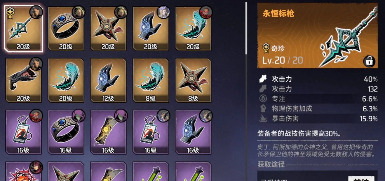 神器目前大家想要使用的话,至少要等到自己的等级突破了25级之后才可以解锁,而且给英雄搭配好足够的神器的话,他们在战力提升上面会有大幅度的提升效果,对于一些战技效果比较直接的角色来说,输出类型的有钢铁人,靶眼女士以及灵蝶之类的角色,这类角色其实在选择神器上面可以选择永恒标枪这个神器,因为它可以带来足够的战技伤害效果,一般在30%的战技提升之后,他们的主要输出手段都会变得更强势一些,而且在伤害上面都能打出大量的实体伤害,如果没有永恒标枪的话,大家也可以考虑搭配不稳定分子这个神器,它虽然带来的只有10%的攻击力,但是是作用在普攻以及战技效果上面的,所以不管是使用哪一个技能,效果上面其实稳定提升都是比较适合前期使用的。