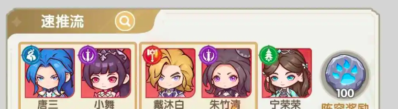 在速推流当中推荐唐三搭配小舞、戴沐白、朱竹清、宁荣荣。其中唐三为主控,小舞为爆发输出,戴沐白为破甲,且戴沐白搭配朱竹清可使用融合技能,而宁荣荣作为加速辅助。这个组合在主线推图和材料副本当中有着非常不错的表现,新手伙伴们可以考虑使用。
