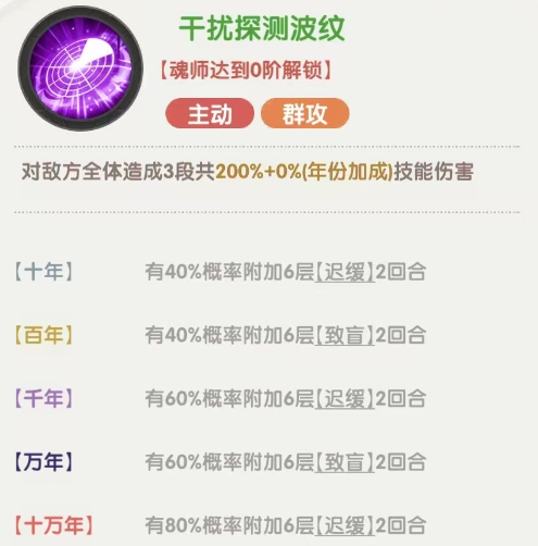白沉香的主动技能可以对敌方全体造成多段伤害,在提升魂环年限后,还有几率附加迟缓、致盲这两种状态。对方被迟缓后会降低闪避,被致盲后降低命中率,是一个很有价值的限制类型技能。第1个被动先发制人,在战斗开始前随机恢复三个队友50点魂力,提升魂环年限后还能额外提升暴击、伤害加深这两项属性。这样对于团队中的核心输出来说,是非常有效的提升。