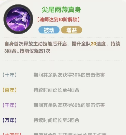 第2个被动踏燕,使自身的普攻变成对一个随机目标造成伤害,优先选择对方的辅助系魂师,还可以使目标额外降低暴击抵抗,为目标附加易伤,使其接下来受到伤害时会有额外的加成。第3个被动尖尾雨燕真身,在首次释放主动技能后就会开启武魂真身,提升全队所有队员的速度,持续三回合。同时还能够使队友获得暴击伤害加成,并且通过提升魂环年限,持续时间可以达到5个回合。
