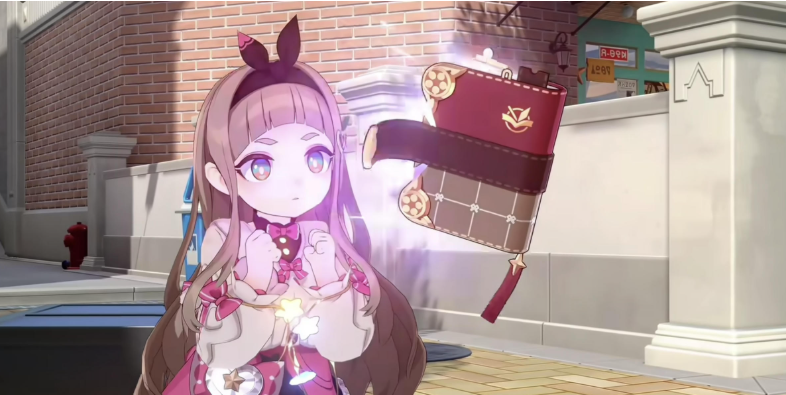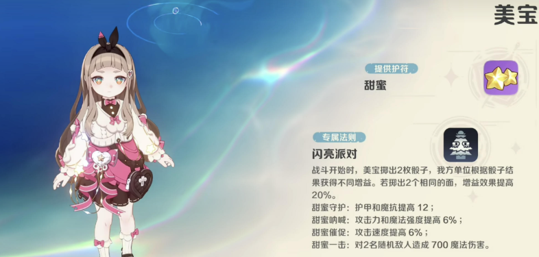 如果大家被美宝外观吸引的话,那么后期在实战上面也要用好这个角色,美宝目前的话,在游戏当中是具有一个亲和力很高属性的角色,她外观上面的黑色蝴蝶结也带来了更多的少女气息,在核心技能上面有一个闪亮派对的效果,这个效果是在战斗的一开始就可以自动触发的,所以说一个被动的能力在此时触发这个技能的话,美宝会投掷出来两枚骰子,这个骰子会决定我方目前团队获得的增益效果是什么。