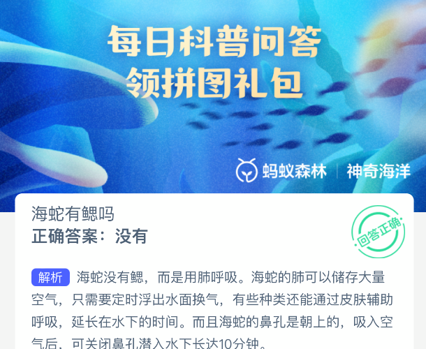 以上就是海蛇有鳃吗?神奇海洋今天答案最新2025年10月28日分享,更多相关攻略内容,请点击关注更新!