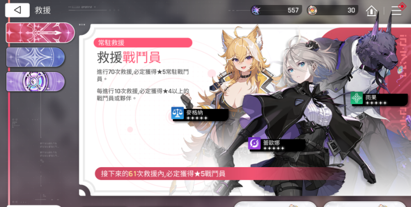救援其实也会有保底机制,例如70次的救援就能有机会拿到五星级的战斗员。包括雨果,还有莫格纳等受到大家关注的。次救援还能有机会获得4星以上的战斗员,又或者是一些品质较高的部件,而这一个救援没有限制,可以是单抽,也可以是10连抽。这些部件对于战斗员而言就可以强化技能,还可以获取属性加成是提升小队综合实力的关键。另外还有一个阶段性五星保底,让玩家在冲刺高星角色的过程中更有盼头。