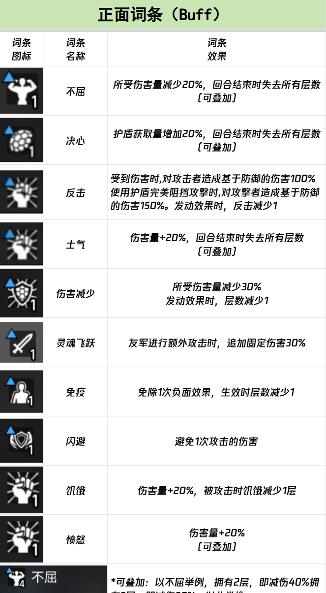 首先,正面词条中有两种非常独特的机制。不屈能够让你在受到伤害时减少20%的伤害量,这听起来像是个简单的防御提升,但需要注意的是它的持续时间并不长,每回合结束时会失去所有层数。不过,好在这个词条是可以叠加的,所以在连续的回合中,你可以通过不断叠加来减少伤害,让自己在战斗中保持更高的生存能力。