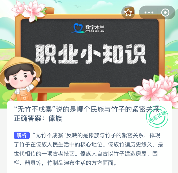 以上就是“无竹不成寨”说的是哪个民族与竹子的紧密关系?支付宝蚂蚁新村最新答案2025年10月29日,更多精彩内容,请点击关注更新!