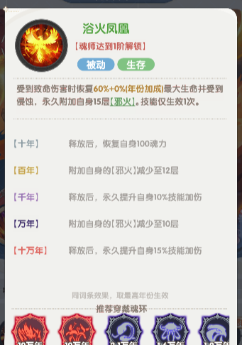 受到致命伤害时恢复60%+(年份加成)最大生命并受到侵蚀,永久附加自身15层【邪火】。技能仅生效1次。