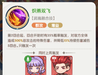 第2回合起,回合开始时有35%概率触发,对敌方全体造成500%总攻击的特殊伤害,并降低15%持续伤害减伤5回合。只触发一次